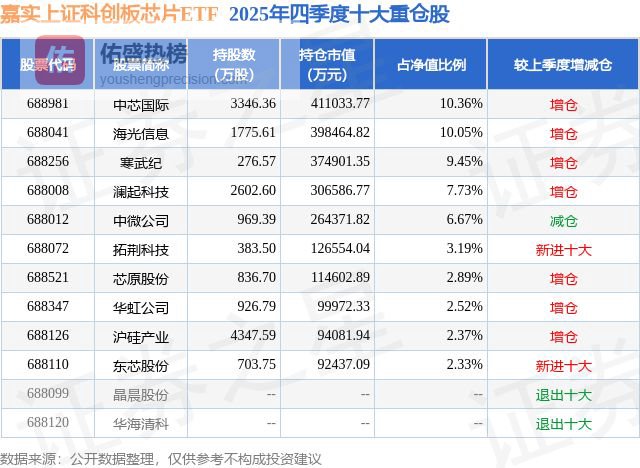 根据2025基金年报公募基金重仓股数据,重仓该股的公募基金共47家,其中持有数量最多的公募基金为嘉实基金的嘉实上证科创板芯片ETF。嘉实上证科创板芯片ETF目前规模为396.58亿元,最新净值2.5057(3月12日),较上一交易日下跌1.33%,近一年上涨50.1%。该公募基金现任基金经理为田光远。田光远在任的基金产品包括:嘉实中证稀土产业ETF,管理时间为2021年3月9日至今,期间收益率为112.23%;嘉实中证软件服务ETF,管理时间为2021年6月4日至今,期间收益率为-14.87%;嘉实中证电池主题ETF,管理时间为2021年7月13日至今,期间收益率为-10.11%;嘉实中证稀土产业ETF联接A,管理时间为2021年8月3日至今,期间收益率为45.95%。