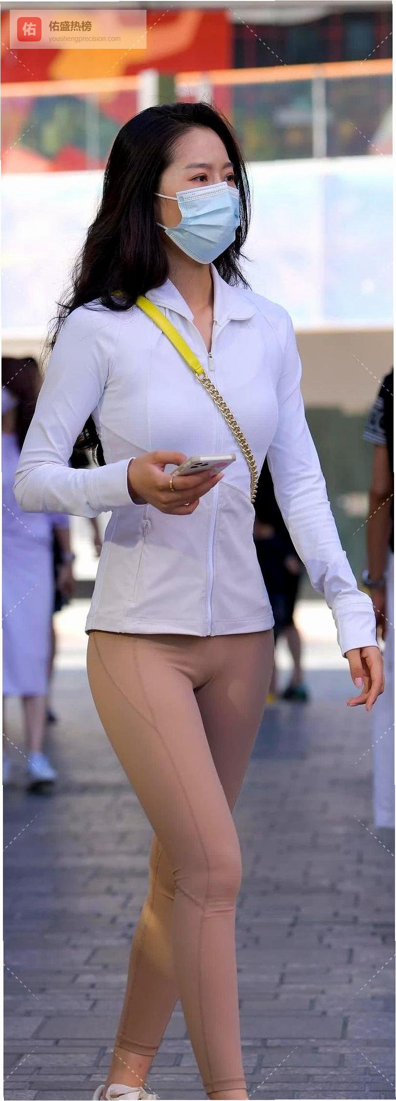 白色拉链衫配杏色打底裤,荧光包点缀,时髦精穿搭示范
