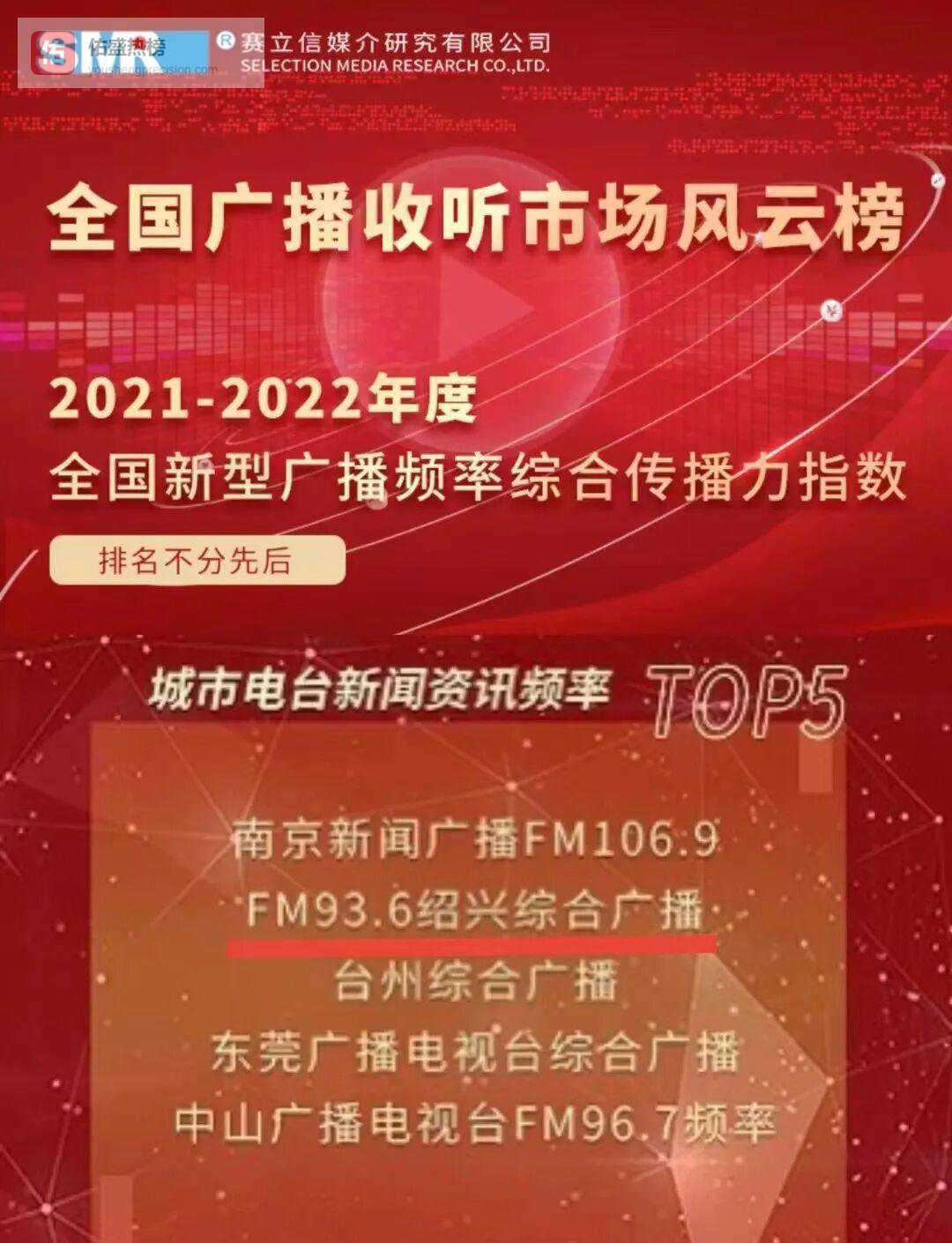 1月18日,赛立信发布“2021-2022年度全国广播收听市场风云榜”,绍兴市新闻传媒中心FM93.6绍兴综合广播再度晋级,连续四年跻身城市电台新闻资讯频率TOP5。同列前五的还有南京新闻广播FM106.9、台州综合广播、东莞广播电视台综合广播、中山广播电视台FM96.7。