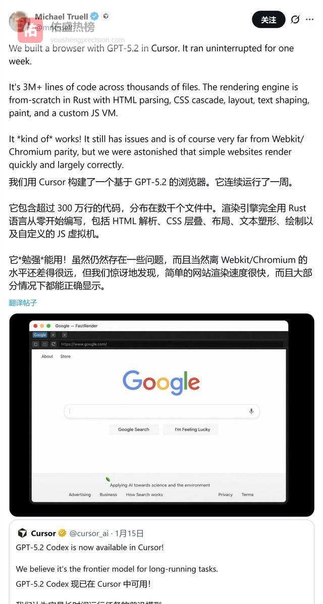 你们猜猜,在AI IDE Cursor里,让GPT-5.2-Codex不吃不喝跑一周,烧出个带Rust渲染引擎的浏览器,要花多少钱?