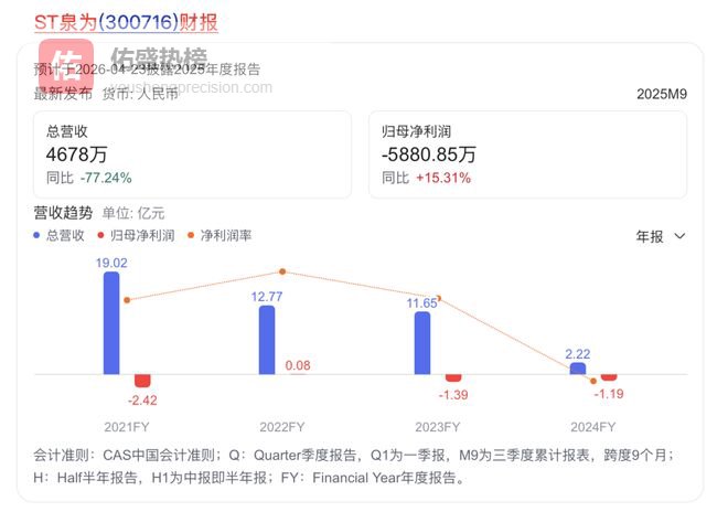 3月4日,ST泉为发布了可能被实施退市风险警示的提示性公告。其2025年度净利润为负值、营业收入低于1亿元且期末净资产为负值,存在触及《深圳证券交易所创业板股票上市规则》(2025年4月修订)第10.3.1条第一款、第二款规定的可能性。
