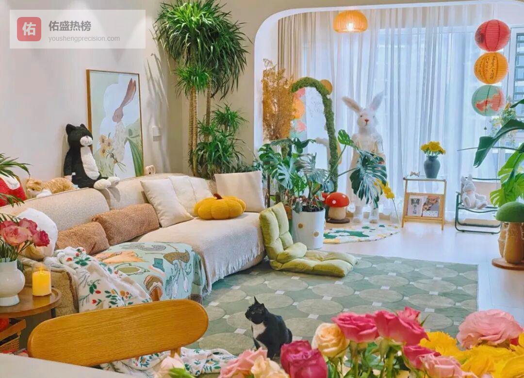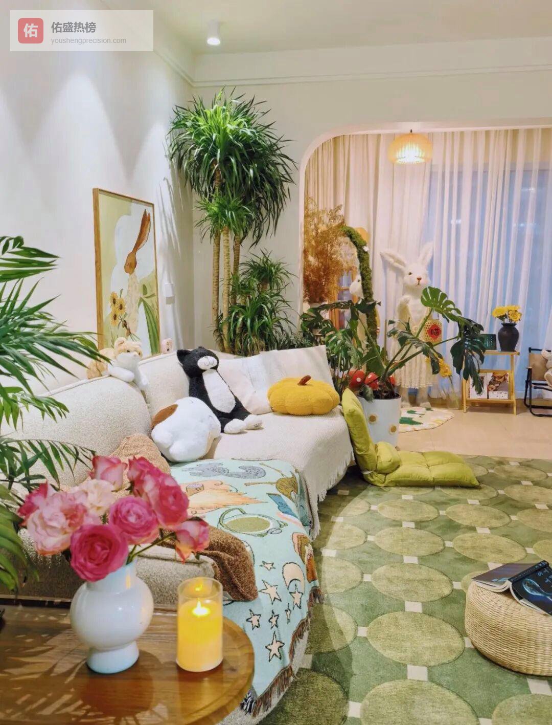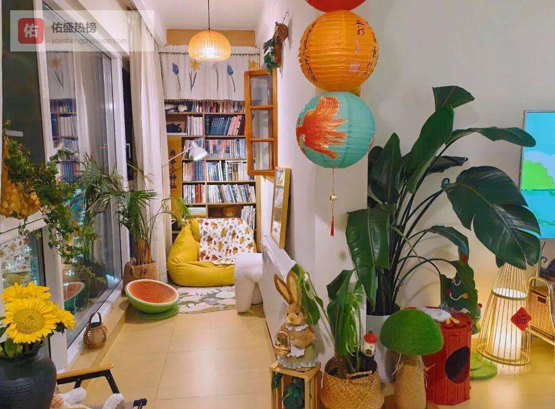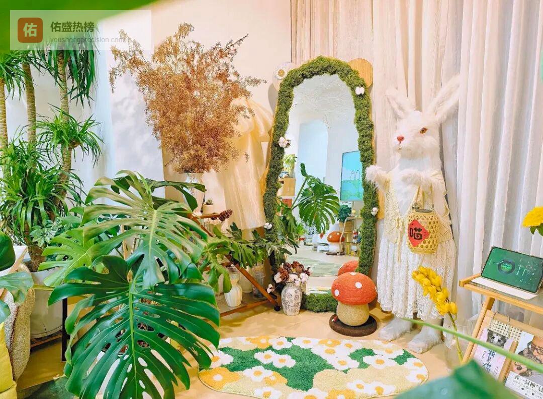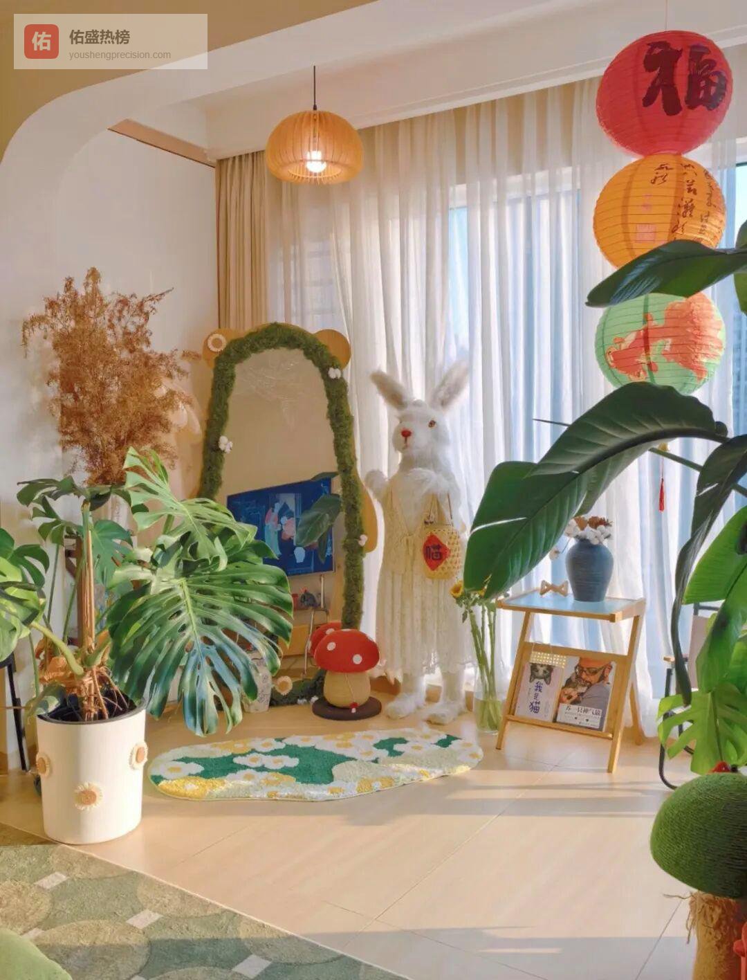 左前方是一个置物架,放置兔子摆件,多肉、铜钱草等,右前方放置蘑菇造型落地灯;
