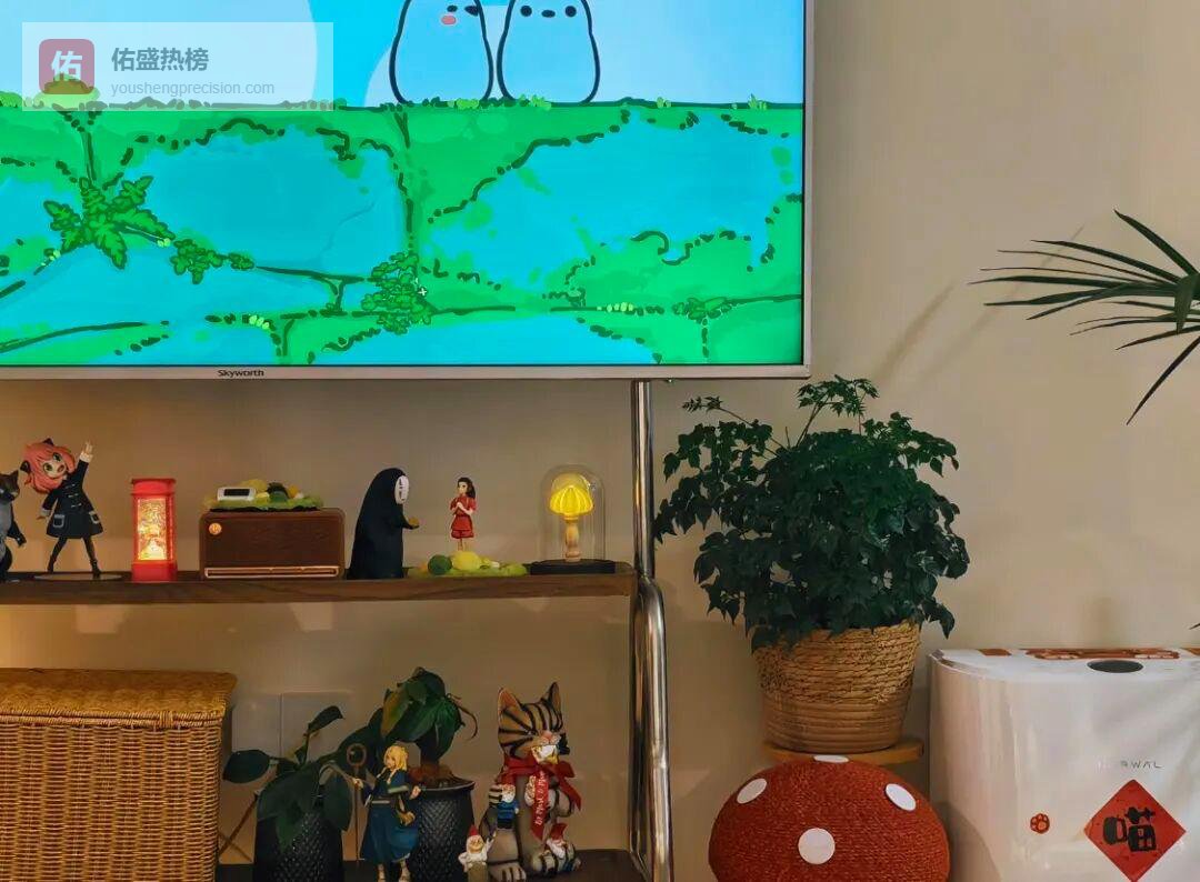 客厅墙面搭配一组壁挂电视,下方放置双层置物架,摆放动漫手办、藤编收纳筐、福字摆件、小型装饰灯等物品;