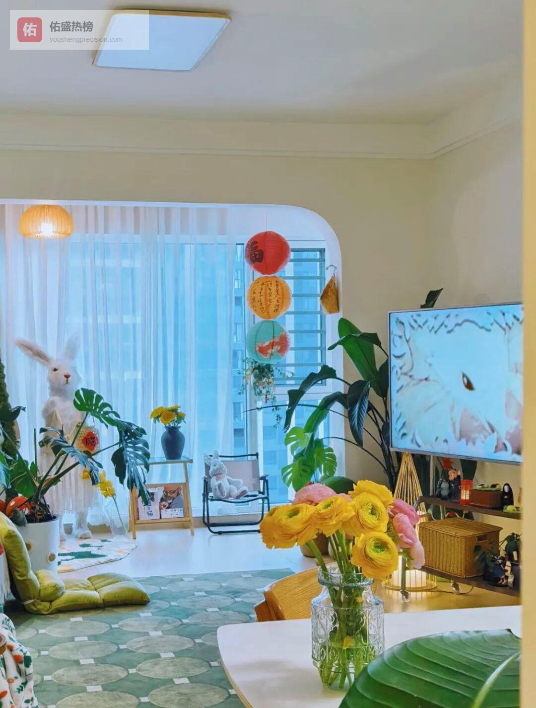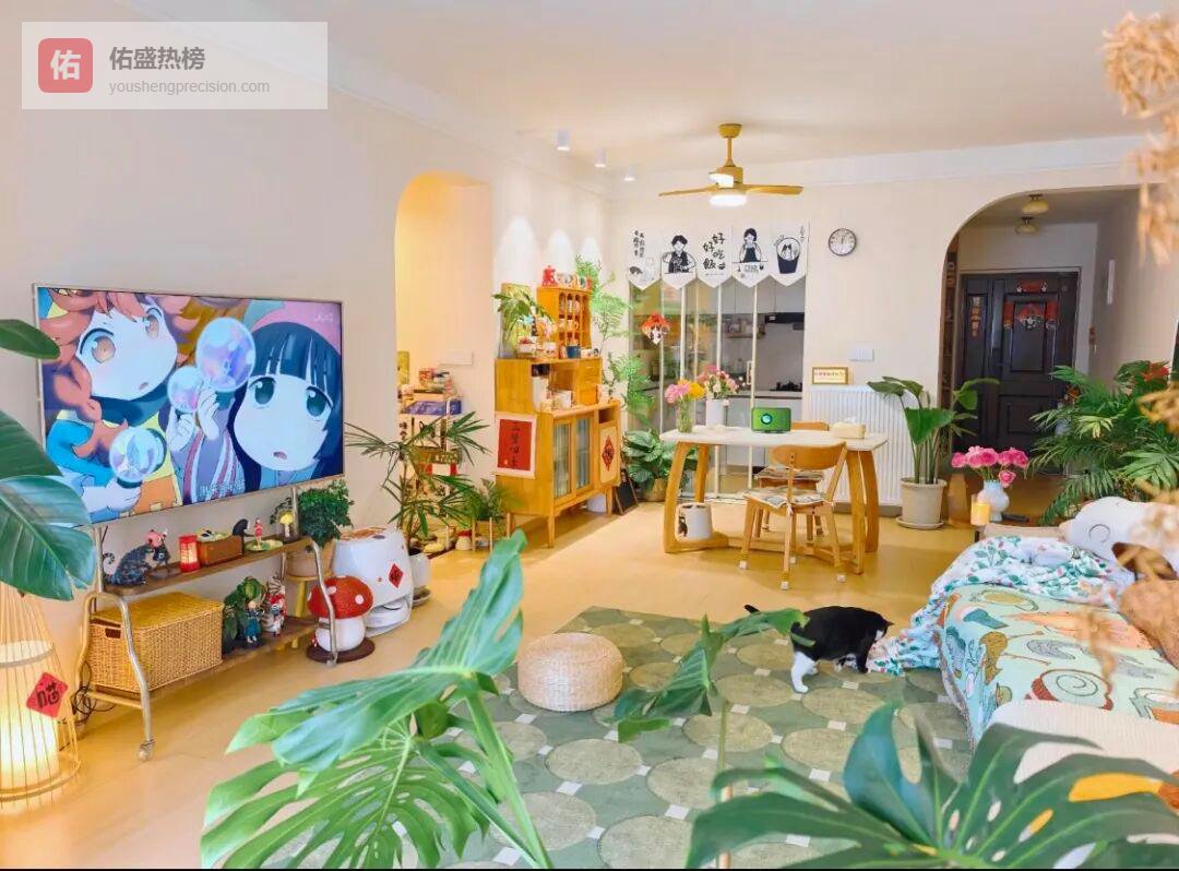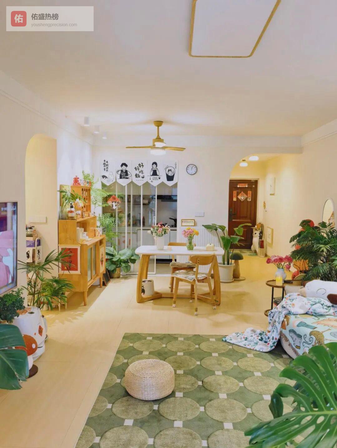 而地面则选择通铺木纹砖,天花没有复杂吊顶,只用石膏线走了双眼皮,搭配大量鲜活绿植与日系软装,烟火气与松弛感并存,一进屋心都融化了。