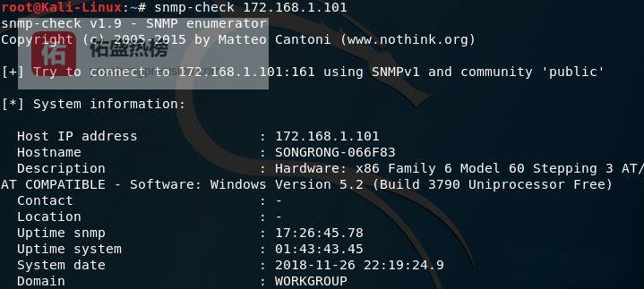 若嫌弃 snmpwalk 输出过于专业,可试试 snmp-check。该工具把 OID 自动映射成易读字段,并给出颜色高亮提示风险等级。