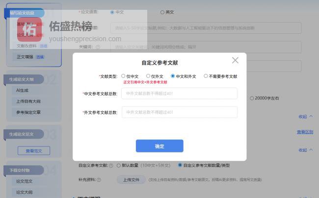该工具在参考文献处理上展现出专业优势,自动生成的引注格式严格遵循GB/T 7714-2015国家标准。在AI写论文过程中,系统会根据论文类型智能配置引文数量,例如毕业论文默认提供20-30篇中外文参考文献,并支持手动调整中外文献比例。这种灵活的引用设置特别适合有特定文献要求的AI期刊论文写作,用户可根据目标期刊的偏好快速调整文献结构。