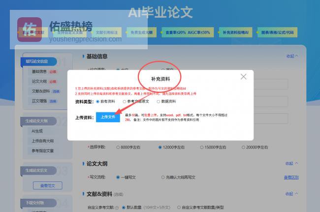 支持用户上传自有资料(如实验数据、未公开文献)与系统文献库进行协同分析。在AI写论文过程中,上传的补充材料会与自动匹配的文献共同作为生成依据,这种混合投喂机制特别适合需要融入原创数据的课题论文写作,确保AI论文生成内容与用户研究实际高度契合。