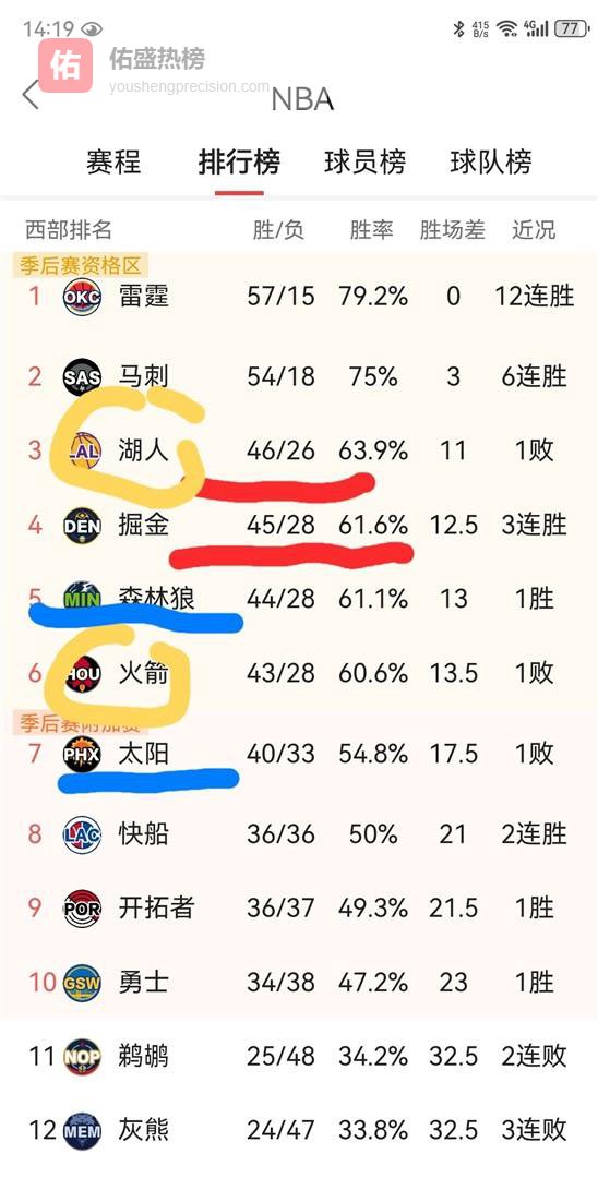 咱们先把目光放得宽一点,看看整个西部的大环境。 现在的西部,强队林立,稍微打个盹儿可能排名就掉下去了。 在这种大背景下,每一场比赛的胜负都显得尤为重要,尤其是对于那些排名咬得很紧的球队来说,一场球的差距可能就是天堂和地狱的区别。 这种紧张的局势,直接导致了各队在战略选择上的不同,有的想冲,有的想稳,还有的在算计着怎么在季后赛第一轮避开那些硬骨头。