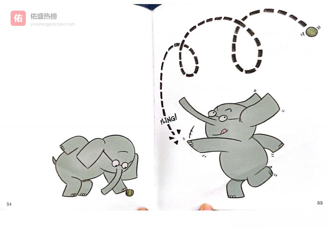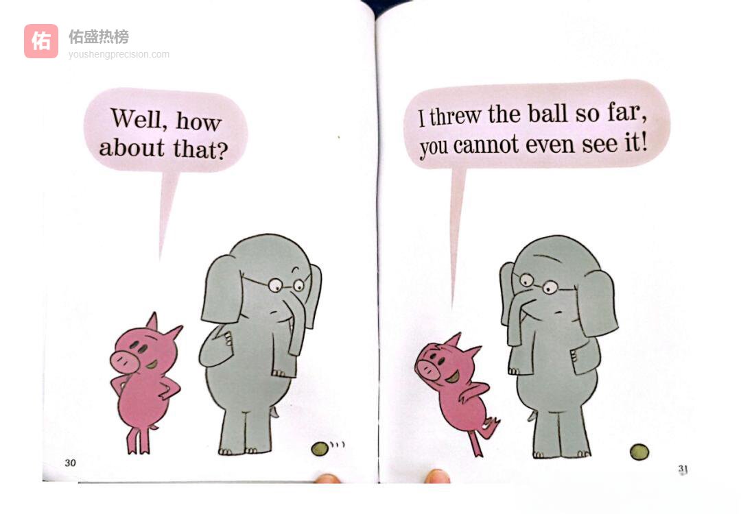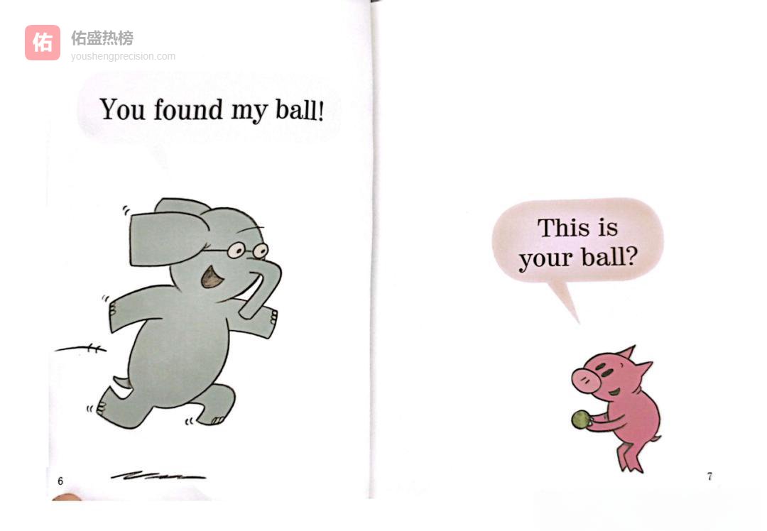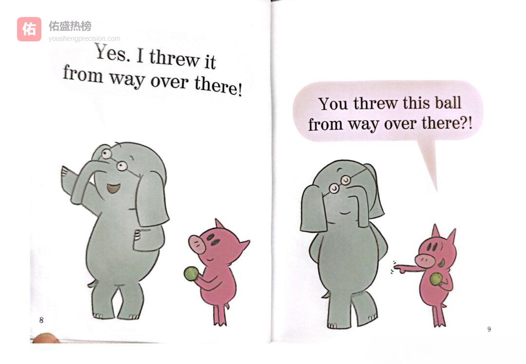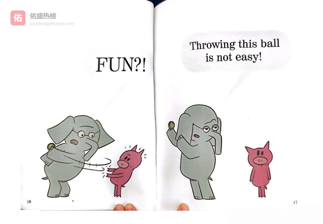 翻开小猪小象系列第三本《Watch Me Throw the Ball》,画面一跳出来,就能感到一股蹦蹦跳跳的快乐气息——小猪还是那副“今天吃啥”的憨态,小象则拧着眉头,仿佛又在担心“球会不会砸到人”。
