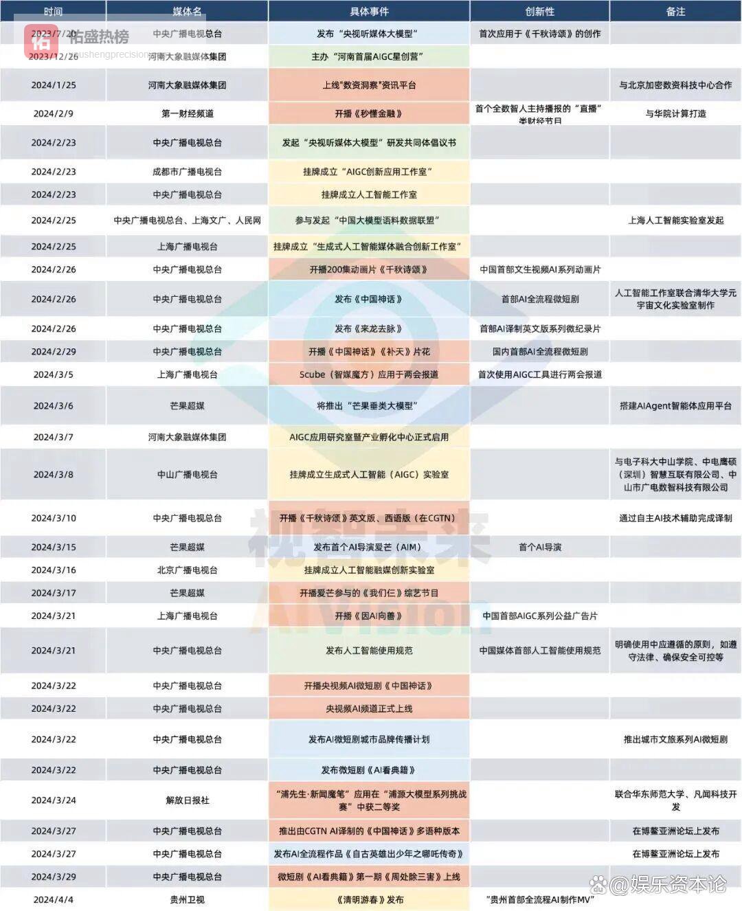 在危机感驱动下,国内广电媒体以惊人的速度拥抱AIGC。娱乐资本论统计,在当时的短短半年时间内,国内广电领域密集爆发了32个AI应用新动向;2-4月各地广电火速推出了13部AI作品。进入3月份后,广电AI化进程进一步提速,相关发布事件比春节前翻倍,平均每1到2天就有全新的AI应用或产品官宣。在这场激烈的“新质生产力”角逐中,各家媒体争抢宣告了10个“全国首创”类AI成果,AI技术用在动画片和公益广告不说,甚至用到了新闻播报里面。