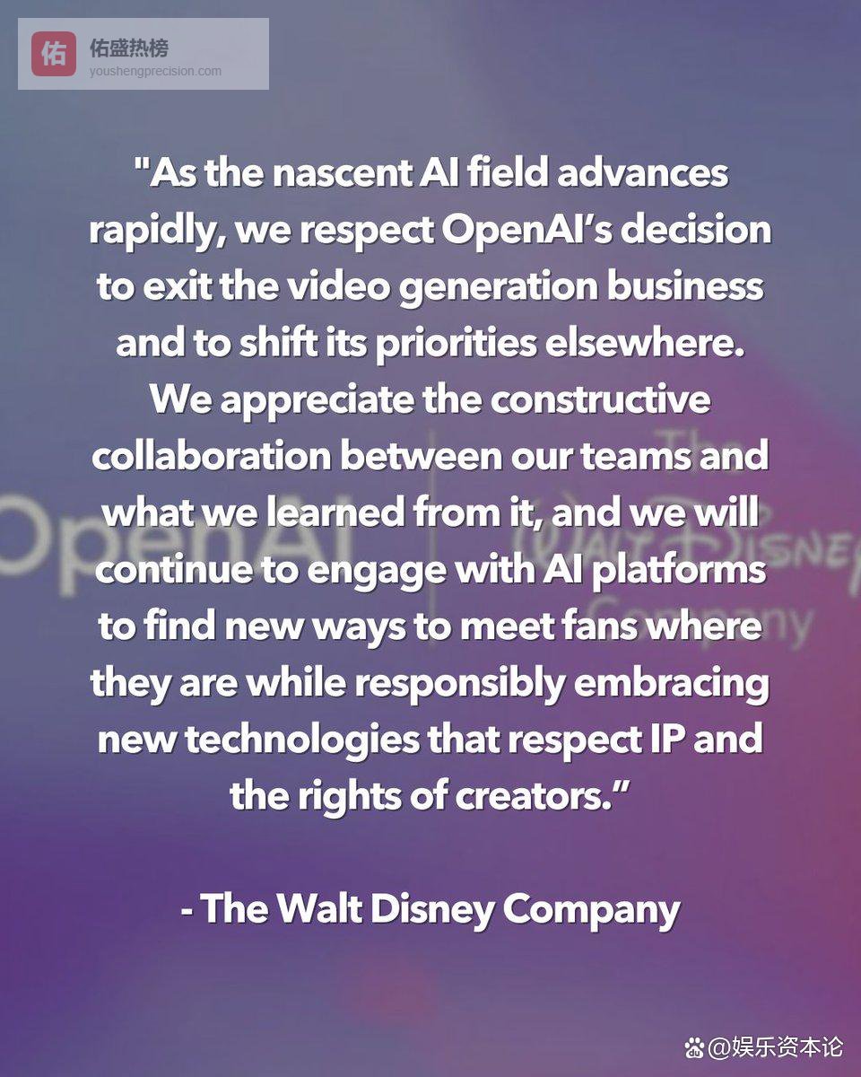 据知情人士透露,由于交易当时只是达成意向,双方在终止交易前从未发生过任何实际的资金往来。迪士尼发表了一份措辞得体的公开声明,表示“尊重OpenAI退出视频生成业务的决定”,“感谢这段合作关系中学到的东西”。