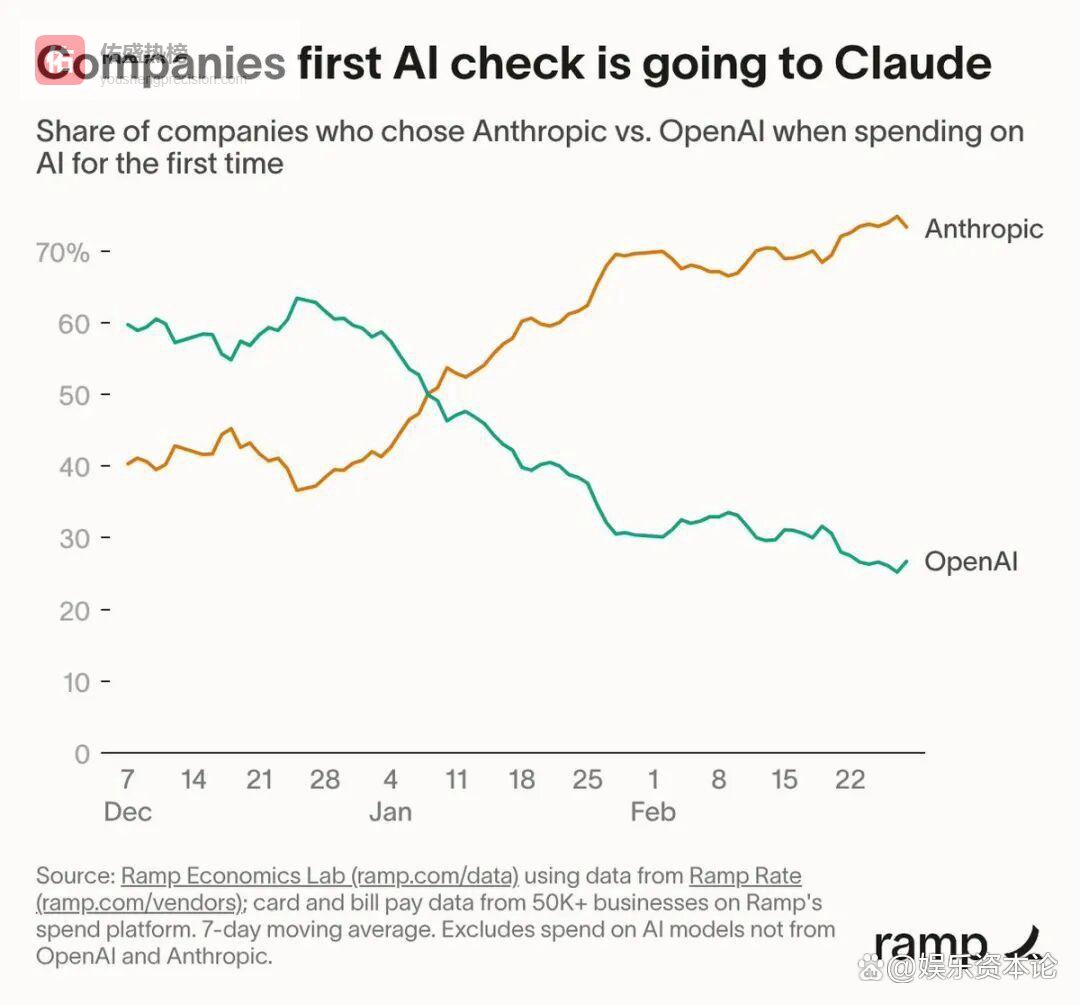 外部压力方面,OpenAI此前在视频模型、机器人、硬件等领域“无所不在、齐头并进”的撒网式策略已被证明是严重的战略失误。相比之下,其死敌Anthropic专注于企业级市场,凭借编程工具Claude Code大杀四方。据最新数据显示,目前首次采购AI的企业选择Anthropic的比例高达70%,是OpenAI的3倍。