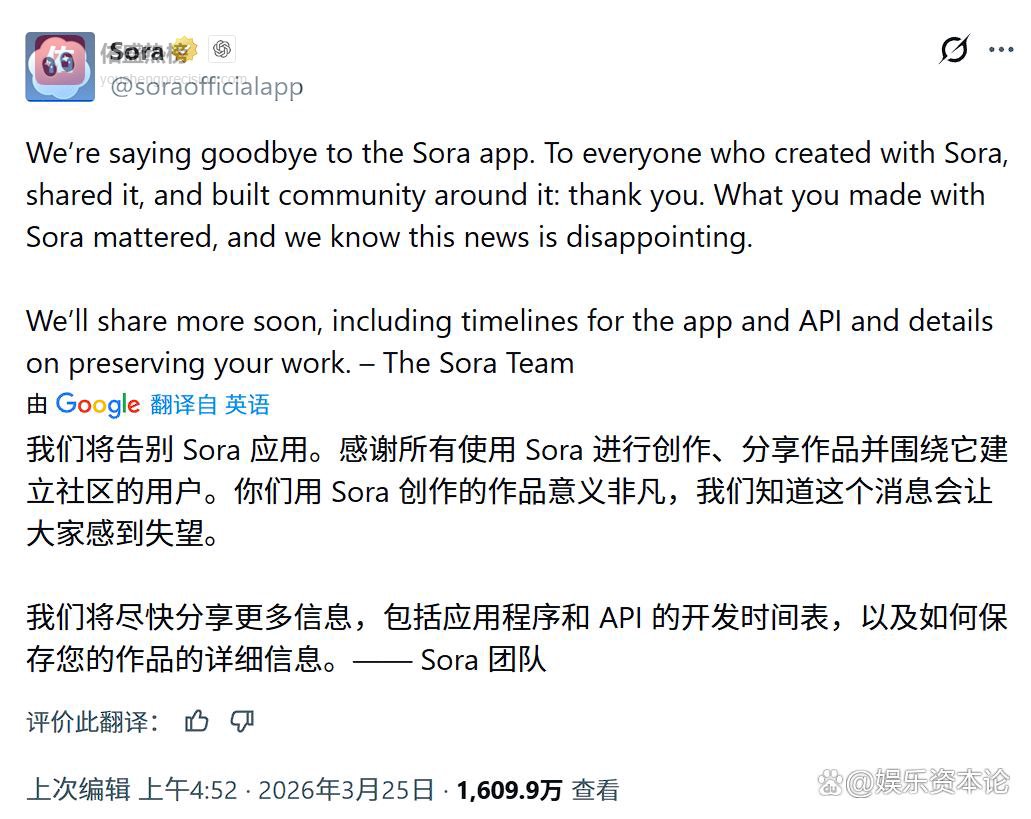 3月24日,曾轰动全球的AI视频应用Sora毫无征兆地被关停了,仅仅存活了6个月。这一决定,连Sora团队内部的部分员工都对此感到惊讶。