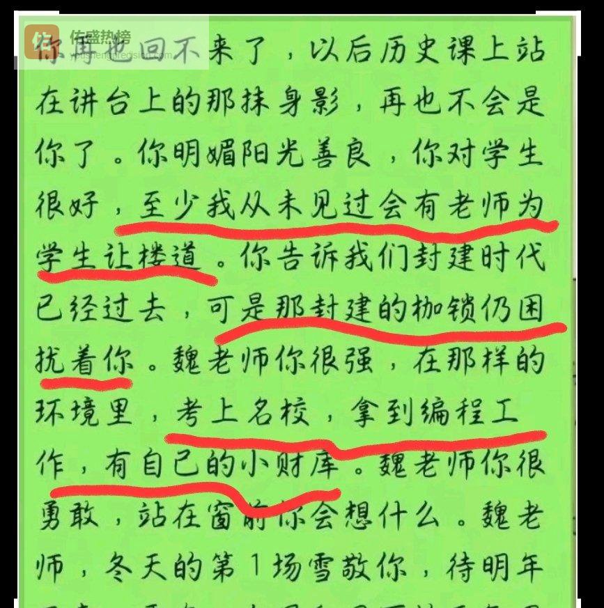 上过她课的同学们都纷纷称赞,说她不仅长得漂亮心地也好,还给她起了个昵称叫“故事大王魏老师”,因为她能把历史故事讲得妙趣横生,人物形象也描绘得栩栩如生。