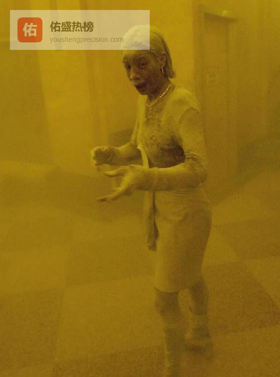 1、28 岁的马西·博德斯 (Marcy Borders) 曾在位于世贸中心的美国银行工作,并在倒塌后幸存下来,照片拍摄于 2001 年 9 月 11 日,他全身沾满灰尘。2015 年 8 月 24 日,博德斯因癌症去世。(照片)斯坦·本田)。