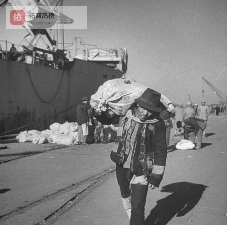 6、1945年,码头上有人弯腰扛货 , 为啥都往码头跑?因为别的地方招工要担保、要学徒 , 只有码头不挑 , 来了就干 , 干了就有饭。
