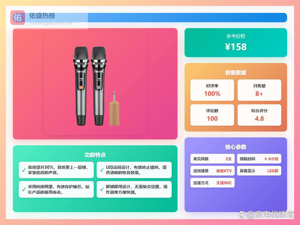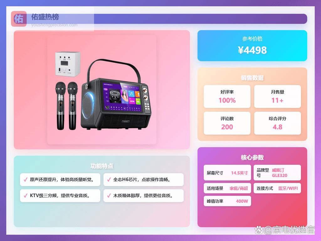 防啸叫功能和DSP芯片,试了下静音效果确实不错,吼叫和杂音都被安抚得很好。无线话筒还支持50米远距离,UHF系统自动对频,跟朋友聊天似的简单。落地支架可以调节高度,壁挂吊顶也没压力,实际用起来真算是“全能型”播放器,会议和娱乐两不误。