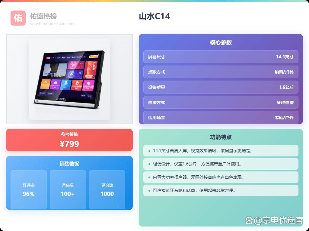 五、山水1. 高清大屏:14.1英寸的IPS屏幕,歌词显示清清楚楚,户外也不怕阳光反光。看歌单、调调子一目了然,还能和朋友比拼谁的歌声更动听,绝对不让人拼错歌词。
