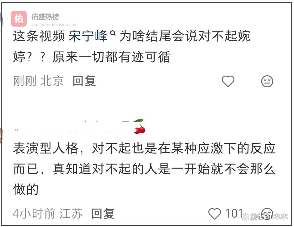 结合画面内容细品发现原来隐藏深意,主画面女儿在舞台上表演钢琴,结尾则晒了宋宁峰流着泪水说着“对不起”的画面。综合出轨爆料,不少网友表示一切有迹可循,不然不会对着张婉婷说对不起,但也有人觉得是表演欲上身而已,并不是诚恳的道歉。