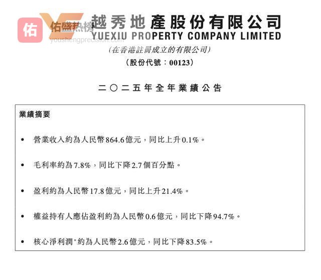 越秀地产2025年营收864.6亿元 核心净利润约2.6亿元
