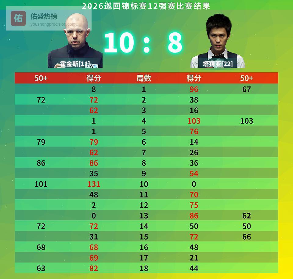 第十七局,霍金斯在乱局中以69-21获胜,9-8率先拿到赛点。第十八局,大势已去的塔猜亚已无力回天,霍金斯稳稳打出单杆62分,以82-44锁定胜局,总比分10-8晋级八强。新科世界公开赛冠军遇克星,霍金斯用他教科书般的防守和关键时刻的冷酷,给这位新科冠军上了一堂关于斯诺克持久战的课。