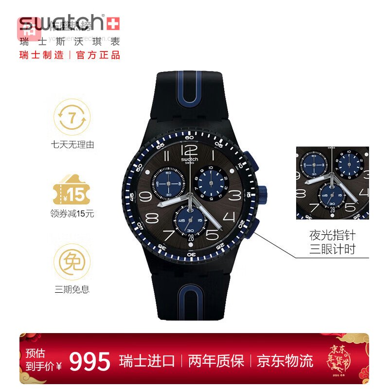 【京东自营】斯沃琪瑞士手表黑蓝轻舟三眼计时新年礼物考试表石英时尚腕表SUSB406¥