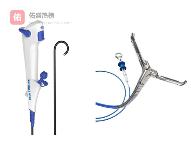 图为新跃医疗入选2025《优秀国产医疗设备产品目录》的一次性输尿管软镜(左)/入选省首批创新医疗器械产品目录的一次性止血夹(右)