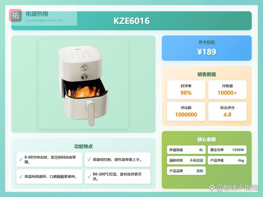 空气炸锅选哪款好,推荐选购这几个品牌一、美的这款美的KZE6016配备了旋风盘技术,通过旋风环流实现食材受热更均匀,不用担心翻烤步骤,操作起来更方便。宽敞的6升大容量设计,适合家庭聚餐,无论是炸鸡还是薯条,都能一次搞定,不用担心不够份量。