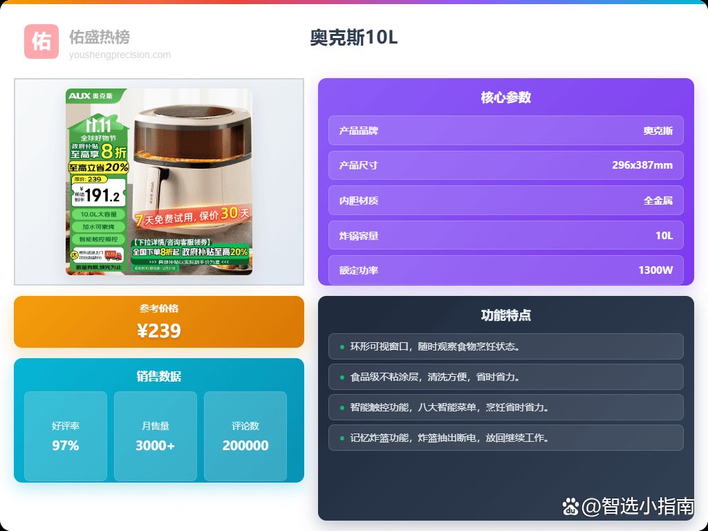 四、奥克斯这款奥克斯空气炸锅拥有10L的超大容量,一次可以烹饪更多食物,特别适合家庭聚会或多人用餐。它的热风加热技术能均匀受热,让食物更快熟透,减少等待时间。全金属内胆设计,耐高温,无异味,烹饪过程中更健康。