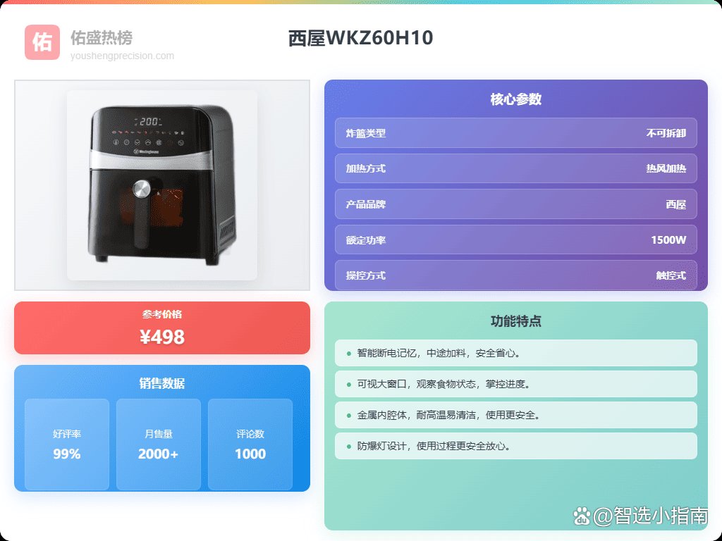 五、西屋这款西屋WKZ60H10空气炸锅采用双热源上下立体加热,1500W的大功率确保食物受热均匀,减少翻面操作,烹饪效率还算不错。它的热风加热方式基本稳定,能快速带来酥脆的效果,但上下管加热的设计还是会让一些用户觉得需要翻面,才不至于一面焦一面不熟。
