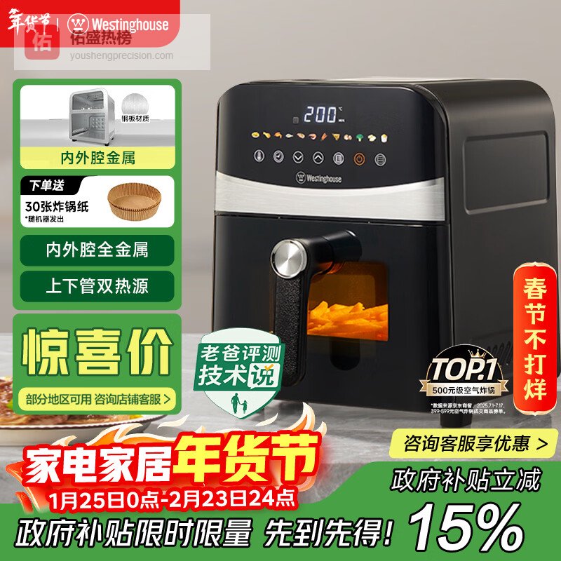 西屋(Westinghouse)可视化空气炸锅6升大容量金属内腔体多功能烤箱免翻面炸锅 WKZ60H10¥