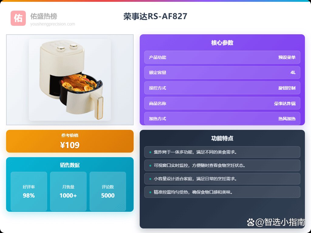 六、荣事达这款荣事达RS-AF827配备热风加热技术,可以实现均匀受热,基本不用担心食物会出现局部焦糊或不熟的问题。微蒸嫩烤功能让食材保持多汁嫩滑,不少用户试做后都觉得肉质特别软烂,口感挺不错。值得注意的是,热风技术虽然效率还行,但对某些较厚的食材可能需要适当调整时间。