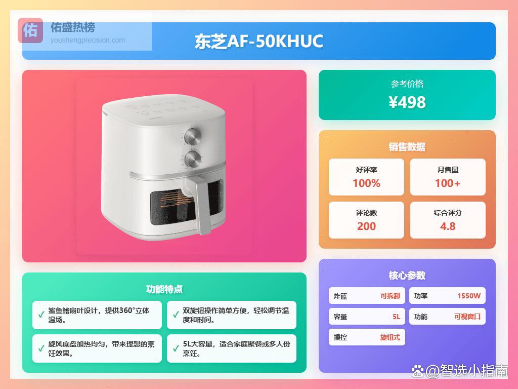 十、东芝东芝AF-50KHUC配备了二代旋风底盘和鲨鱼鳍扇叶,实现360°立体加热,让食品受热更均匀。无论是炸鸡还是烤蔬菜,用起来确实挺稳,食材的受热不再有死角,效果还算让人满意。