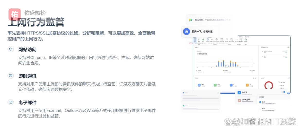 上网行为管理: 详细记录员工访问过的网页地址、时长及频率,有效识别并限制与工作无关的娱乐、社交及购物网站。