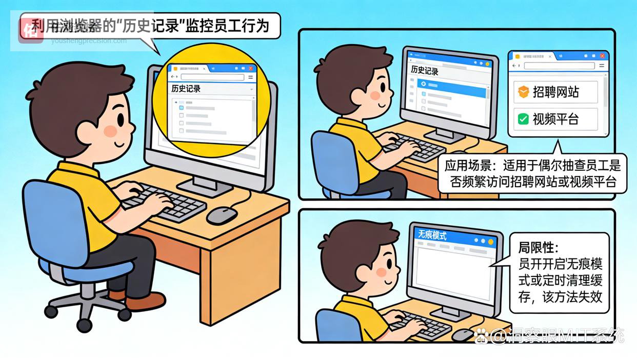 局限性: 员工如果开启“无痕模式”或定时清理缓存,该方法就会失效。