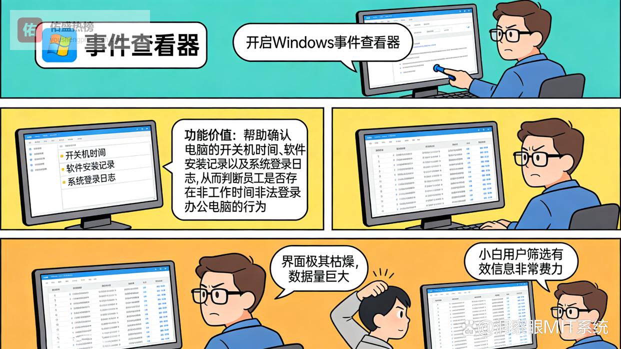 功能价值: 帮助确认电脑的开关机时间、软件安装记录以及系统登录日志,从而判断员工是否存在非工作时间非法登录办公电脑的行为。