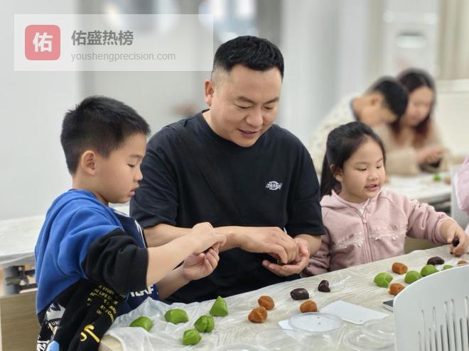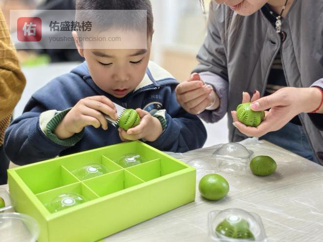 最让人期待的手作青团正式开启!翠绿的青团剂子、香甜的豆沙馅、咸香的蛋黄馅整齐摆放,孩子们撸起袖子,把剂子放在掌心揉啊揉,即便一时揉不圆,也在爸爸妈妈的鼓励下耐心尝试;搓圆、摁坑、填馅、收口、搓圆,再用夹子在青团外表夹出精致纹路,一颗颗俏皮可爱的青团便大功告成。