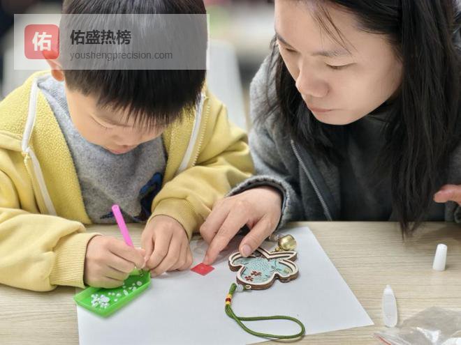 听完了清明的故事,小手和大手便一同开启了非遗织锦与清明习俗的浪漫碰撞——亲子携手共同制作一个专属的“织锦纸鸢”。大人们耐心地扎着纸鸢骨架,孩子们则兴致勃勃地挑选着色彩艳丽的织锦,小心翼翼地将织锦糊在骨架上,轻轻压紧、抚平,再贴上亮晶晶的珠片,绕上柔软的丝线。不一会儿,一个个纹样精美、灵动雅致的纸鸢陆续诞生,它们虽不能像真风筝一样翱翔天际,但风一吹,下方的小铃铛便发出“叮叮当当”的声响,清脆悦耳,既承载着亲子间的温情,更传递着非遗传承的文明力量。