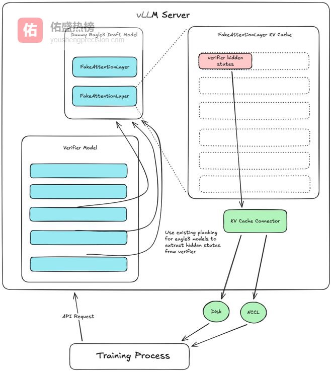 下图是这套系统的整体设计——通过复用 Eagle-3 的隐藏状态管道和 KV Connector API,实现了零侵入的隐藏状态提取: