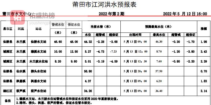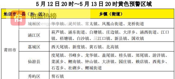 ❒ 山洪莆田市水利局12日16时发布山洪灾害风险预警:黄色预警覆盖39个乡镇、蓝色预警覆盖7个乡镇。预计未来24小时,山体“喝饱”后易松动,沟谷洪水来势汹汹。