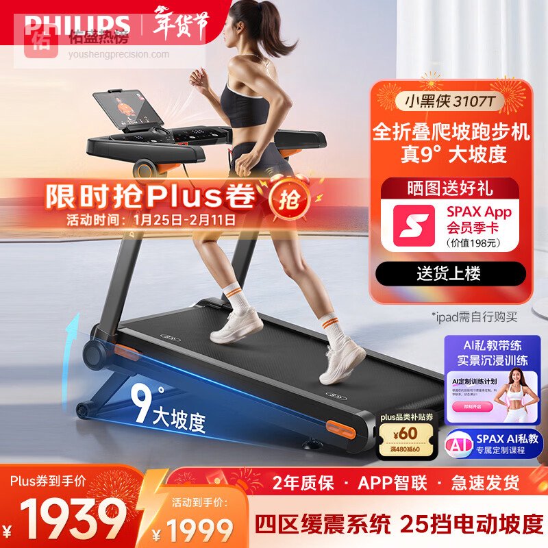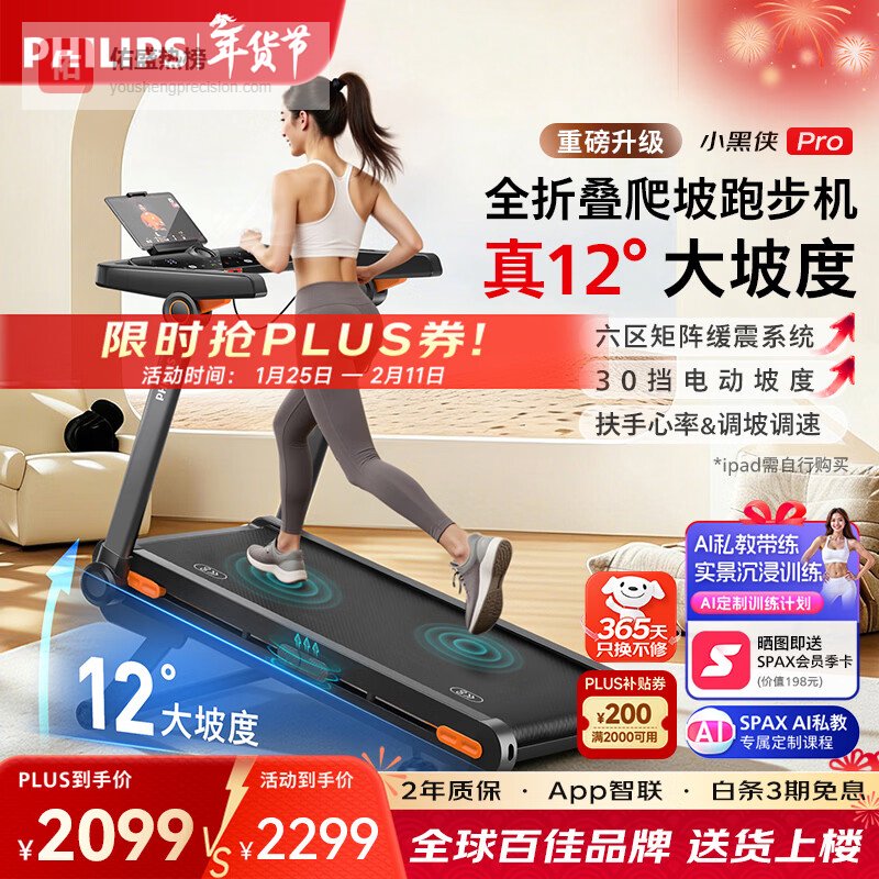 【品牌直营】飞利浦小黑侠智能跑步机全折叠家用静音室内健身房器材爬坡走步机3107T小黑侠真9°大坡度¥