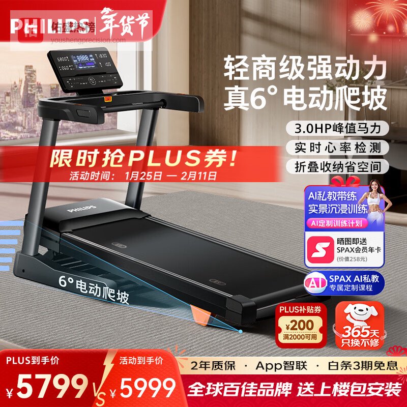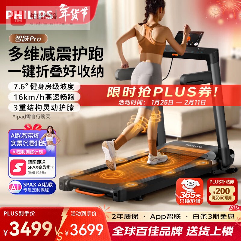 【京东自营】飞利浦跑步机家用智能静音可折叠室内小型电动爬坡健身房专用器材3105T¥