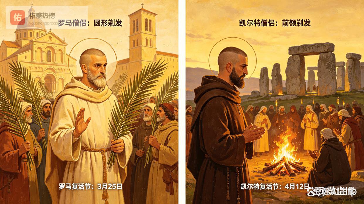 在具体宗教礼仪与实践规范上,两大教会的差异直观且难以调和,成为理念冲突的外在体现。复活节日期计算是双方最核心的礼仪争执:罗马教会遵循教廷统一历法推算,确立全欧洲统一的节日标准;凯尔特教会则沿用本土古老算法,与罗马教会确定的日期长期存在偏差,导致同一地区信徒分时段庆祝复活节,直接造成信仰群体割裂。
