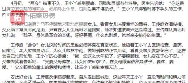 在这段时间,王小丫拉着来照料她的老爸的手,悄声唠叨:“以后咱们得一块儿好好混日子!”