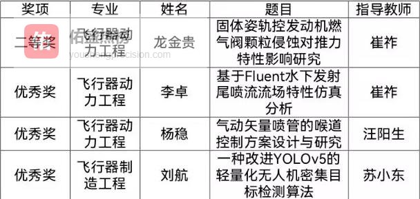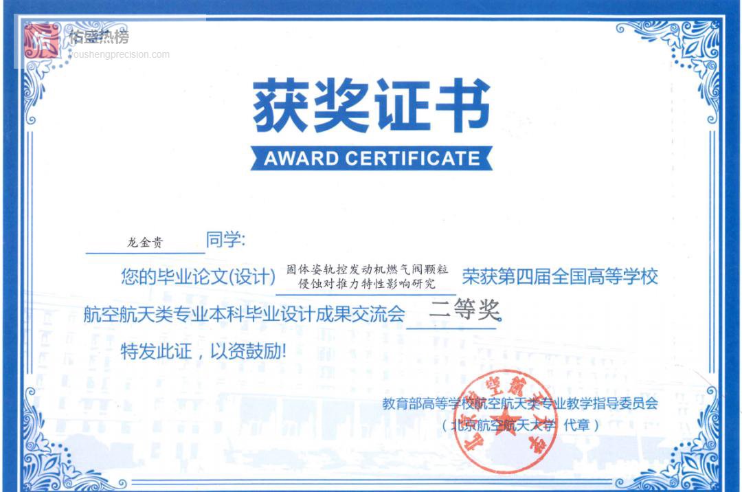 经过激烈角逐,航空航天工程学院龙金贵同学的毕业设计从众多作品中脱颖而出,斩获二等奖;李卓、杨稳、刘航三位同学分获优秀奖。这是我校毕业生在此项赛事中拿下的首枚全国性奖牌,标志着学校航空航天类本科人才培养再上新台阶。