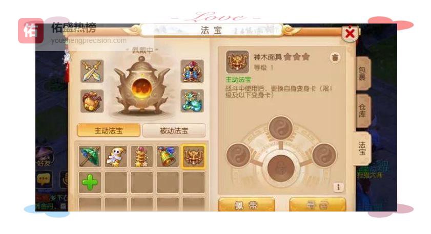 神木面具的升级路径与常规法宝一致,银币+精华双消耗: