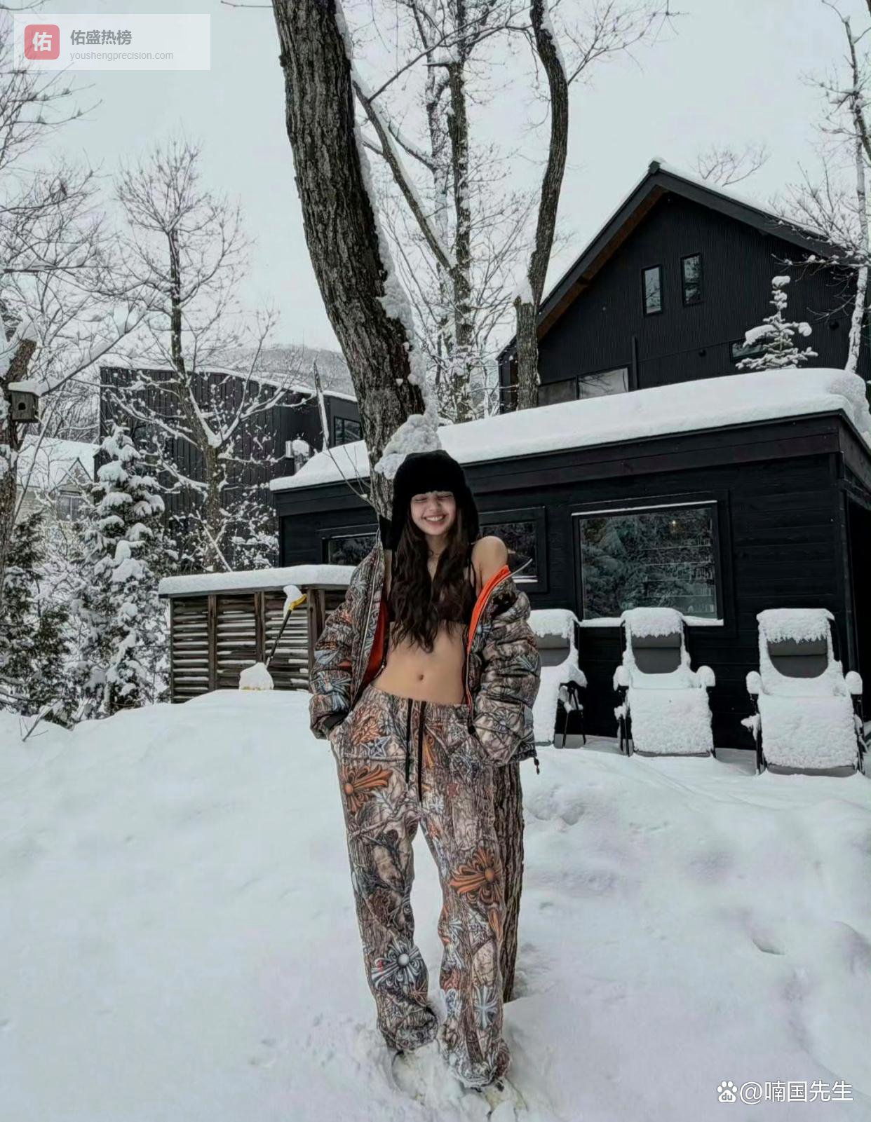 Lisa发布雪地比基尼照并配文“感谢Airbnb带来雪天温馨居所”后,迅速成为全球时尚焦点。照片中黑色比基尼与厚重羽绒服的极致对比,创造出强烈视觉冲击。