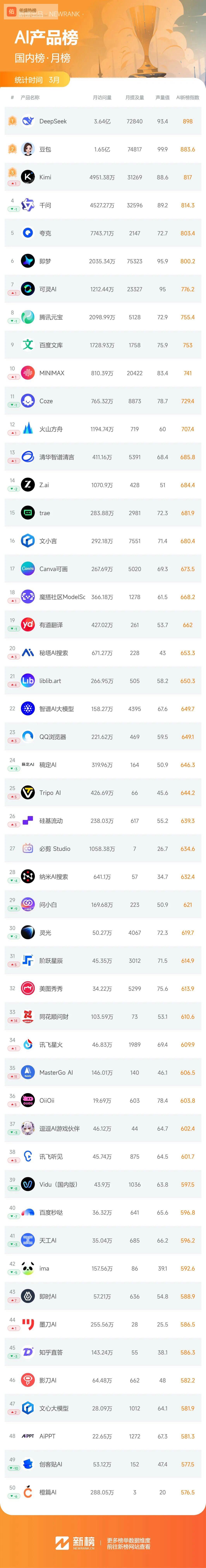 本期国内榜,DeepSeek和豆包依然稳坐前二,而Kimi挤掉千问进入了前三,MINIMAX则超越Co