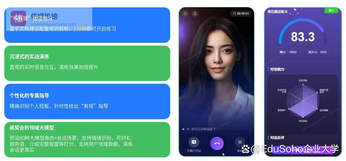 即时反馈校准: 员工可以通过手机端随时随地进行语音对练。AI会针对话术逻辑、专业度、情绪控制进行多维度打分,并给出修正建议。