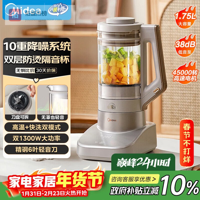 美的(Midea)安睡低音系列破壁机悬浮降噪 1.75L双层防烫隔音杯家用多功能细腻无渣豆浆机 国家补贴MJ-PB13S69¥